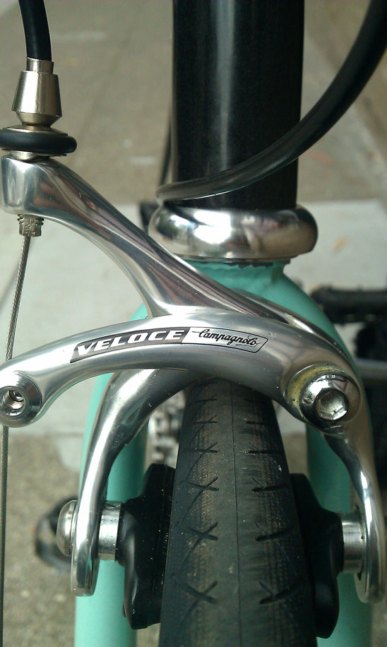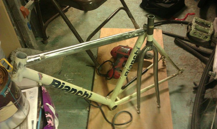 So Lizard had been in the need of a new bike for a while, long before the morning Twitch had it break down on his cross-city hungover ride. So for last Christmas I built her up an old Bianchi Brava that had had been unfortunately neglected. I got the frame, fork, and cranks from a buddy who had it laying in the back of his shop for a great deal and had a black Deep-V laced to a 9speed hub that I was willing to part with myself. First thing first it needed to be stripped and cleaned, I got to taking everything apart and removed all the paint with a little thinner and a soft wire wheel on my drill (was even able to remove a little surface rust as well!)