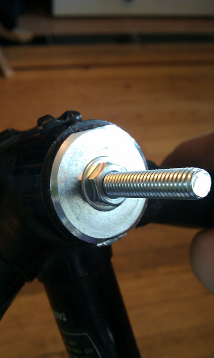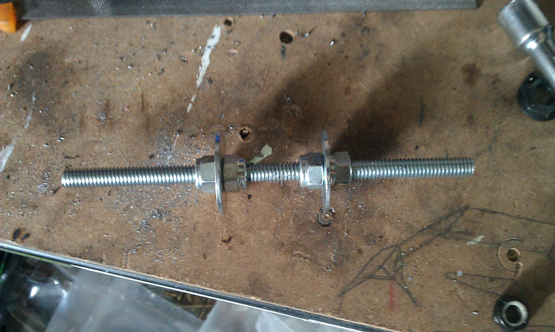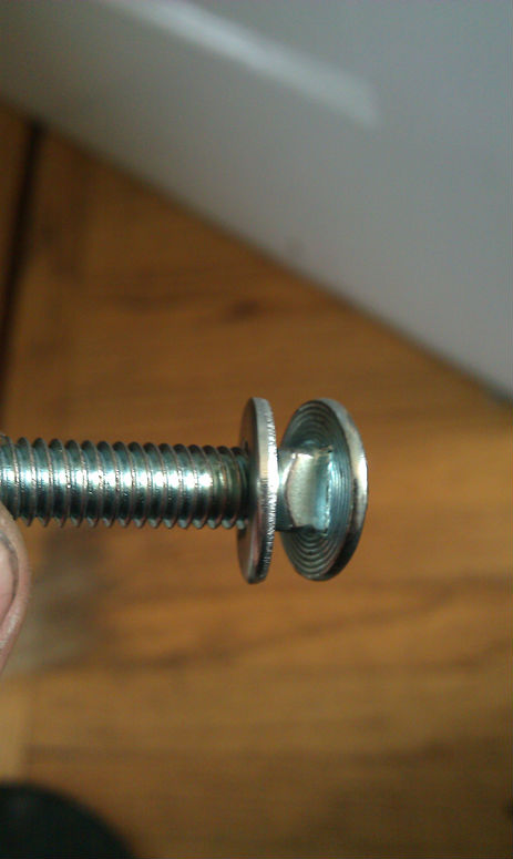 All I need are some rubber stoppers to cover the cut tubing and there you go! The 5/8" Rod used as the axle Is the same size as used on a skateboard truck. The two additional washers help to fit snugly into the bottom bracket shell. I found washers that had an i/d of 5/8 that I was able to press into the original cups from the bottom bracket. With the axle slid into the shell and a simple hex nut added on each side to tighten it all the axle is extremely rigid. For the rear, I found these 5/8" flushing bolts at the hardware store that conveniently had square notches at the end which fit perfectly in the horizontal dropouts. I used just a bolt on the dropout with simple hex to keep the pressure off of the bearings while maintaining rigidity.
