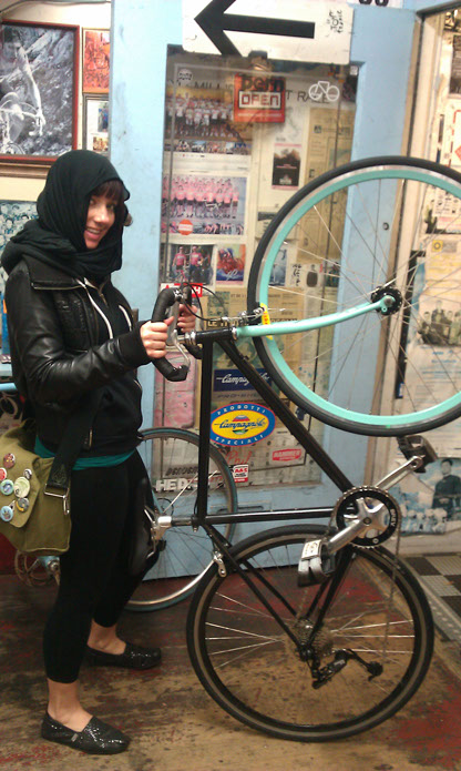 After the frame was painted I needed to finish sourcing the rest of the parts, she wanted townie bars but since the bike is so small at 47cm, everything I looked at were way too big for it proportionally. So I thought, flat pursuit bars flipped backwards. I could even use the bar-end levers and would look really clean, and it worked out perfect. Also since I was planning on only running a 1×9 group and I wanted the bike to have a vintage yet modern look I thought that by using a Suntour power shifter, but modifying it to mount on the bars would be a cool way of re-purposing an old style lever (that is still loved by all) in a more modern method and style.  The rest of the group was comprised of a Sram X-4 derailleur pulling across a Shimano wide-range 11-32 cassette with a 42t Brev chainring up front, giving it a nice range around the city.  Keeping with the vintage yet modern feel I found some Campy Veloce brakes that looked super clean on the set-up. I finished it off with a set of Vittoria Zaffiros and of course a pair of GMB  straps and couldn’t have been more pleased with the build. It really came together nicely and was gratifying as hard work paying off in the end. And think Lizard was pretty happy with it too!