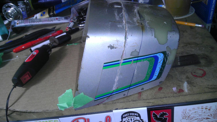 So over the last 8 months or so I have been in the process of rebuilding 1978 JCPenny Pinto which was manufactured by Puch/Kromag. (Don’t worry, there is a post still to come covering the build!) Well when I bought it it was about 65% complete and in need one of the most important items– a seat.  I decided it would be a fun project to fabricate my own in the Cafe Racer style, but that still complemented the lines and shape of the original bike.  I luckily came across an old Puch Magnum trunk, which is the Pinto’s big brother, and thought it would make an awesome starting point. It maintains the style of an original Puch race-stlye rear fairing and technically is OEM (Right?). Since the Pinto is significantly smaller than the Magnum I figured that by cutting down the depth of the trunk it would help maintain proper ratio for the bike. Then my next step was to create my shape; I used the width of the trunk for the rear and then tapered it  towards the front with a curve to mimic the front of the gas tank. I mocked up a cardboard template to see how it may look and was pleased with the feel.