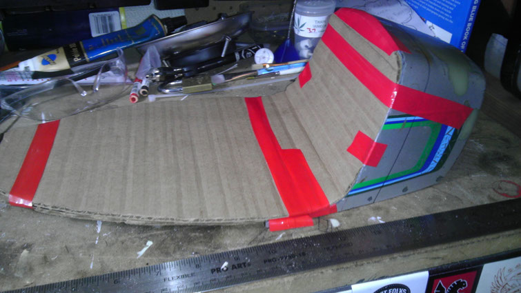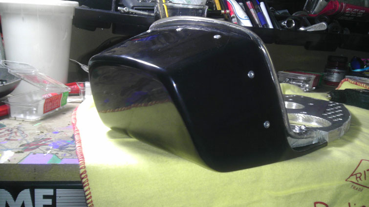 After cutting down the trunk I wanted to fill in the hole where the trunk door would go. I thought it would be cool to still keep its original  functionality, but to switch it up a little. Originally the Magnum would have a door that enters the trunk from the rear; well first off I didn't get that piece when I sourced the trunk and secondly I thought it would be a little sleeker if the fact that it was a trunk was hidden. Since I planned on making the upholstered seat-pan section removable from the seat I could create the entrance to the trunk right underneath it.  So I created the shape to fill the void and cut out a piece of 1/8” ABS to fill it in. I scored the side I was going to be adhering for a better connection, as well as placed ridges around the perimeter to keep it from moving at all once it was in place. I then taped the piece flush and used a hard silicone sealant and filled it all in from the inside. After the sealant dried I took off the tape and then proceeded to use some Bondo (for bumpers!) to plane the outer surface of the trunk. Once I was satisfied withe the shape it was painted, primed, and clear-coated to match the rest of the bike.