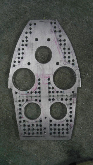 Then my next task to create a base plate to mount the trunk to and furthermore mount it to the bike. This segment needed to be extremely rigid since it was only going to be mounting on the bike by about the first 30% of the plate and was going to be able to obviously support my weight. I decided to go with a 3/8″ piece of aluminum that I could then machine the base from.  I then cut out my shape with an angle grinder and then proceeded to machine 1/4”  standard round perforations to lighten the plate. I also created 5 larger holes; 2 to accommodate for travel of the gas canisters on the hydraulic rear shocks I was going to be using for the build, as well as one in the center for the end of the seat tube and 2 in the trunk section for more weight reduction.