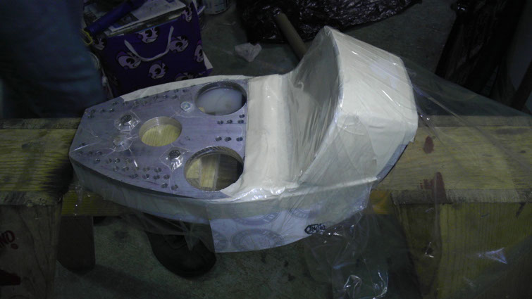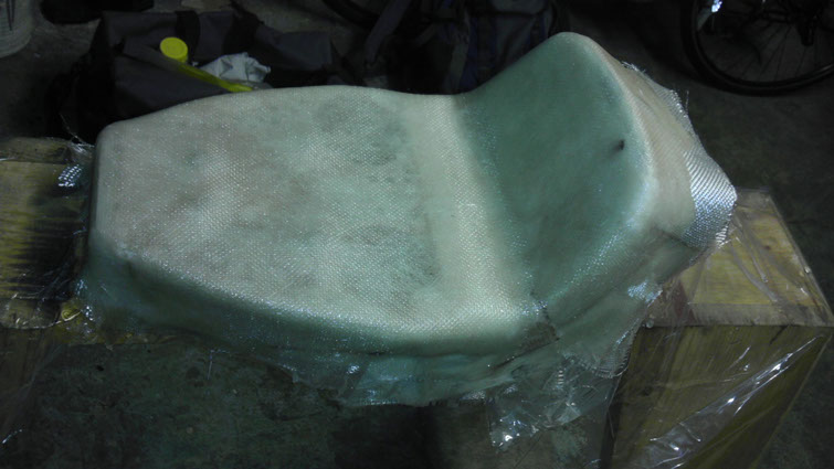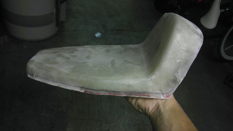 Now it was on to creating the fiberglass seat-pan that would sit over the base that would be then padded and upholstered. I first mounted the seat on a sawhorse to better work with while fiberglassing, and after smoothing all the edges with some card stock I sealed it up with a sheet of adhesive vinyl to keep all  epoxy off the physical seat, then it was time for glassing.  After it dried on the mold for a couple days I removed it and cut the shape down to size with a dremel. After it was cut down I used some industrial strength velcro to connect the seat-pan to the base while maintaining its removability to access the trunk.