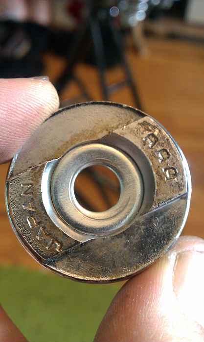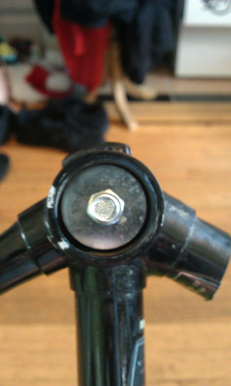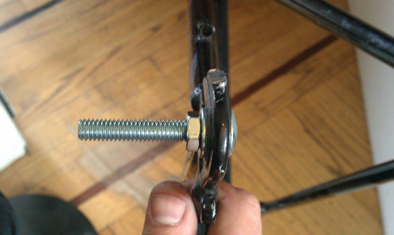 All I need are some rubber stoppers to cover the cut tubing and there you go! The 5/8" Rod used as the axle Is the same size as used on a skateboard truck. The two additional washers help to fit snugly into the bottom bracket shell. I found washers that had an i/d of 5/8 that I was able to press into the original cups from the bottom bracket. With the axle slid into the shell and a simple hex nut added on each side to tighten it all the axle is extremely rigid. For the rear, I found these 5/8" flushing bolts at the hardware store that conveniently had square notches at the end which fit perfectly in the horizontal dropouts. I used just a bolt on the dropout with simple hex to keep the pressure off of the bearings while maintaining rigidity.