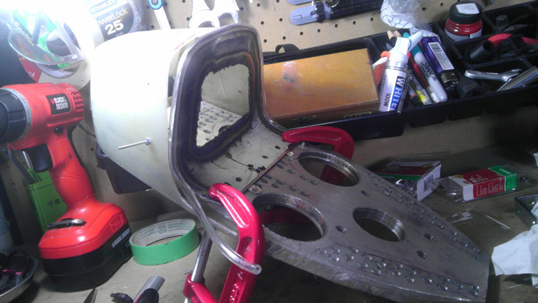 Then my next task to create a base plate to mount the trunk to and furthermore mount it to the bike. This segment needed to be extremely rigid since it was only going to be mounting on the bike by about the first 30% of the plate and was going to be able to obviously support my weight. I decided to go with a 3/8″ piece of aluminum that I could then machine the base from.  I then cut out my shape with an angle grinder and then proceeded to machine 1/4”  standard round perforations to lighten the plate. I also created 5 larger holes; 2 to accommodate for travel of the gas canisters on the hydraulic rear shocks I was going to be using for the build, as well as one in the center for the end of the seat tube and 2 in the trunk section for more weight reduction.