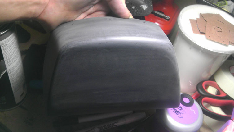 After cutting down the trunk I wanted to fill in the hole where the trunk door would go. I thought it would be cool to still keep its original  functionality, but to switch it up a little. Originally the Magnum would have a door that enters the trunk from the rear; well first off I didn't get that piece when I sourced the trunk and secondly I thought it would be a little sleeker if the fact that it was a trunk was hidden. Since I planned on making the upholstered seat-pan section removable from the seat I could create the entrance to the trunk right underneath it.  So I created the shape to fill the void and cut out a piece of 1/8” ABS to fill it in. I scored the side I was going to be adhering for a better connection, as well as placed ridges around the perimeter to keep it from moving at all once it was in place. I then taped the piece flush and used a hard silicone sealant and filled it all in from the inside. After the sealant dried I took off the tape and then proceeded to use some Bondo (for bumpers!) to plane the outer surface of the trunk. Once I was satisfied withe the shape it was painted, primed, and clear-coated to match the rest of the bike.