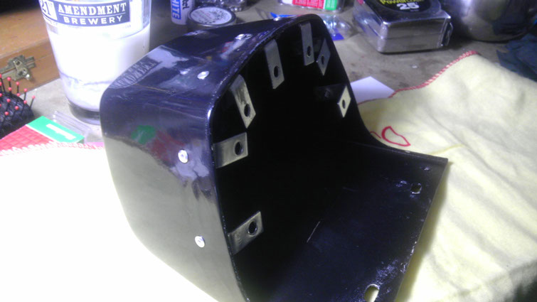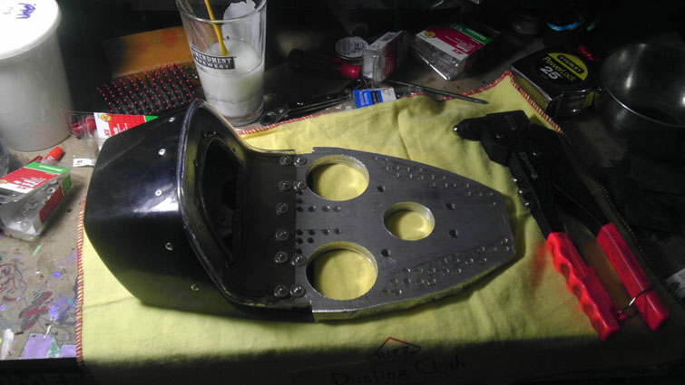 I then had to fabricate the ‘butt-stop’ which would transition the bottom of the seat plate 90 degrees to the top of the trunk. For this I needed a much thinner material and found a piece of 16g stainless steel sheet that was perfect. after cutting and rolling my piece from my template shape I cut a hole in the center of it with a torch for entrance to the trunk. Since the upholstered seat-pan portion I designed to be removable from the base of the seat you can then take it off and get right into the trunk (with just enough room for a few tools and a bottle of 2-stroke oil). The decision then was to figure out how I was going to mount the 3 pieces of the main part of the seat–the baseplate, the butt-stop and the trunk–together as one. I thought that rivets would look the cleanest and most professional as well as would maintain a flush detail inside and out. So I proceeded to ‘tack’ the three pieces together and riveted it all as one, using 90 degree mending braces to mount the butt-stop to the trunk.