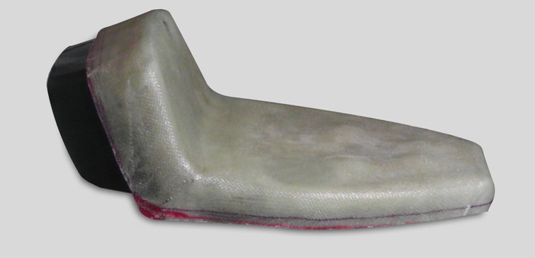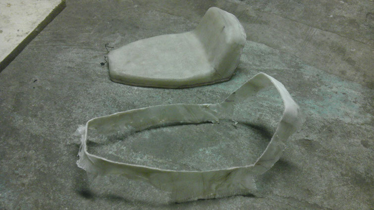 Now it was on to creating the fiberglass seat-pan that would sit over the base that would be then padded and upholstered. I first mounted the seat on a sawhorse to better work with while fiberglassing, and after smoothing all the edges with some card stock I sealed it up with a sheet of adhesive vinyl to keep all  epoxy off the physical seat, then it was time for glassing.  After it dried on the mold for a couple days I removed it and cut the shape down to size with a dremel. After it was cut down I used some industrial strength velcro to connect the seat-pan to the base while maintaining its removability to access the trunk.